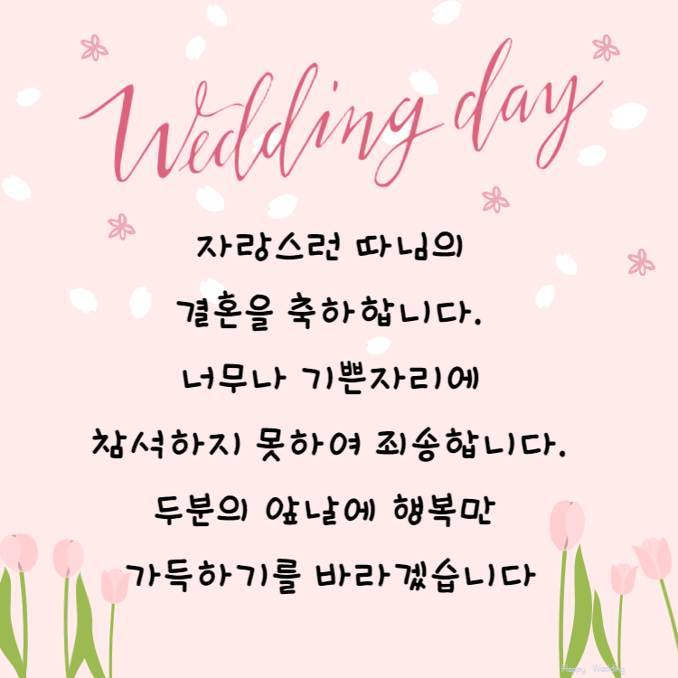 결혼 축하할 때 보내면 좋은 메세지 인사말을 만들어보았습니다. 지인의 결혼식이나 친구 자녀의 결혼식, 참석 가능하지 못할 경우 인사말을 모아보았으니 많은 이용 부탁드리겠습니다.