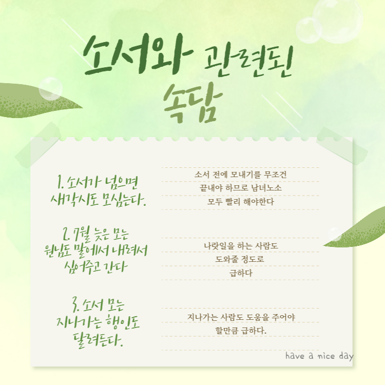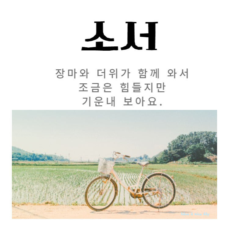 작은 더위 소서 이미지입니다. 한자로는 작을소(小) 더울 서(暑)를 씁니다. 큰 더위란 뜻의 대서 앞에 쓰이는 절기입니다.