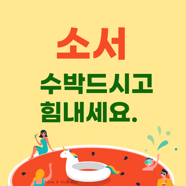 소서 이미지 인사말입니다. 더위에 지치기 쉬운 소서입니다. 상큼한 과일 많이 드시고 기운 내세요.