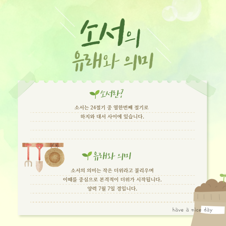24절기의 열한 번째의 소서의 뜻은 작은 더위라는 의미입니다. 더위가 본격적으로 시작하고 장마도 오고 그런 시기를 뜻하는데 정말 오해는 딱 들어맞는 것 같습니다. 소서 다음 절기는 대서이며 아주 큰 더위를 뜻한다. 소서 인사말 이미지를 만들어 보았으니 많은 지인 친구들에게 카톡 메세지나 문구를 보내보는 것도 좋을 듯싶습니다.