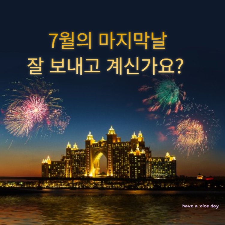 7월 마지막주 인사말 이미지입니다. 벌써 7월의 마지막 주입니다. 뜨거운 열정이 가득하게 보내셨나요? 다가오는 8월도 기대해보아요. 올해 여름은 아직 끝나지 않았으니 즐겁게 행복하게 열정적으로 보내시기 바랍니다.