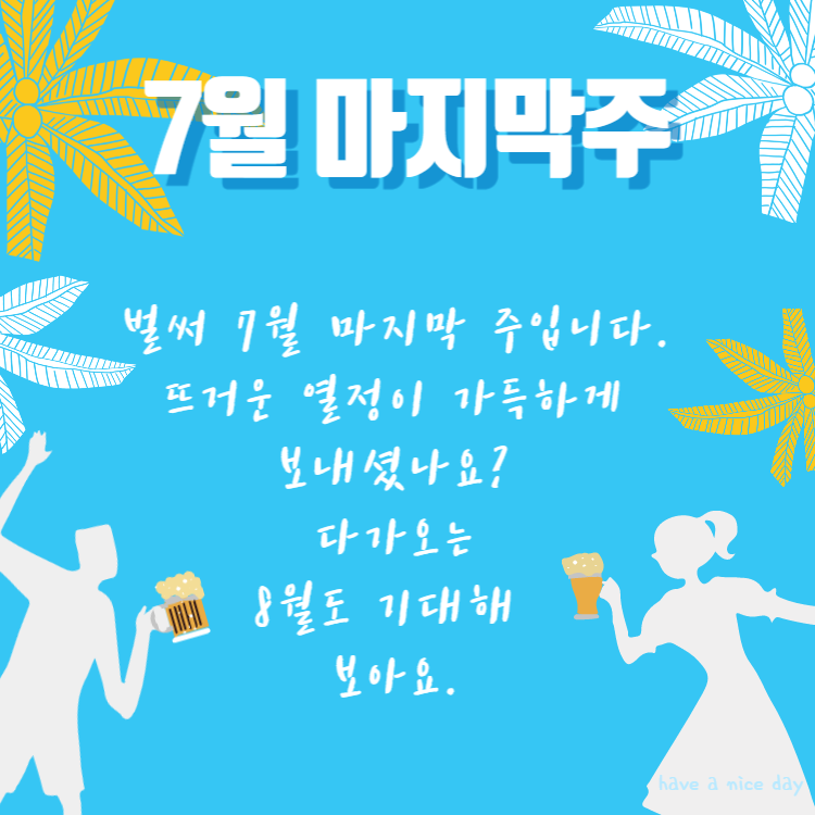 7월 하순 인사말입니다. 행복한 7월 되었나요? 8월에도 더 좋은 일만 생겼으면 좋겠습니다.