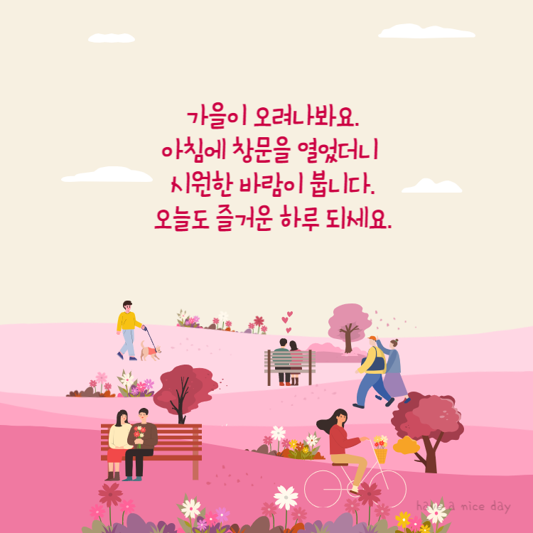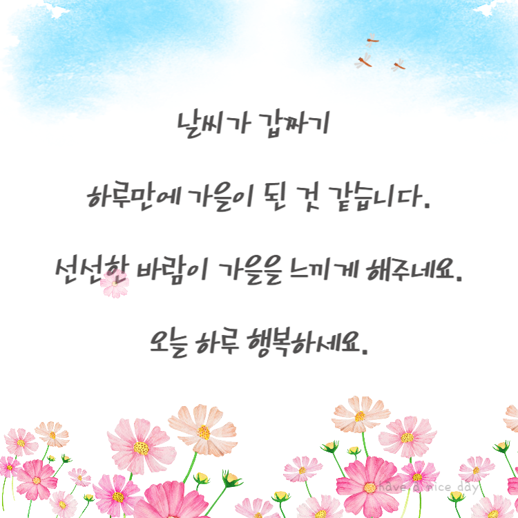 하루만에 날씨가 여름에서 가을이 된 것 같습니다. 선선한 바람이 가을을 느끼게 해주는 것 같아요. 오늘 하루도 행복하세요. 아래 첨부파일 다운로드하셔서 지인들에게 보내보세요.