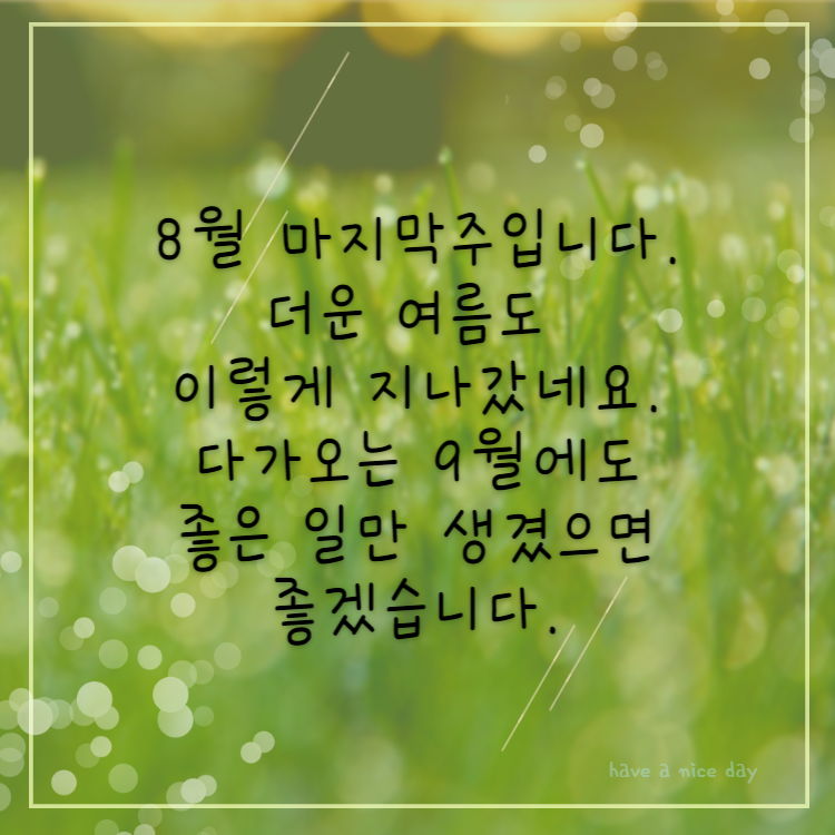 8월 마지막주 인사말 이미지입니다. 끝나지 않을 것 같은 더위도 이제 이렇게 지나갔네요. 다가오는 9월에도 좋은 일만 생겼으면 좋겠습니다