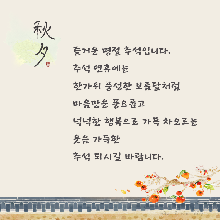 즐거운 명절 추석입니다. 추석 연휴에는 한가위 풍성한 보름달처럼 마음만은 풍요롭고 넉넉한 행복으로 가득 차오르는 웃음 가득한 추석 되시기를 바랍니다.