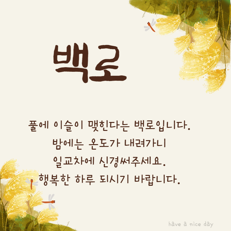24절기의 백로는 하얀 이슬이란 뜻입니다. 풀에 이슬이 맺힌다는 뜻이지요. 밤에는 온도가 내려가니 일교차에 신경 써주시고 행복한 하루 되시기 바랍니다.