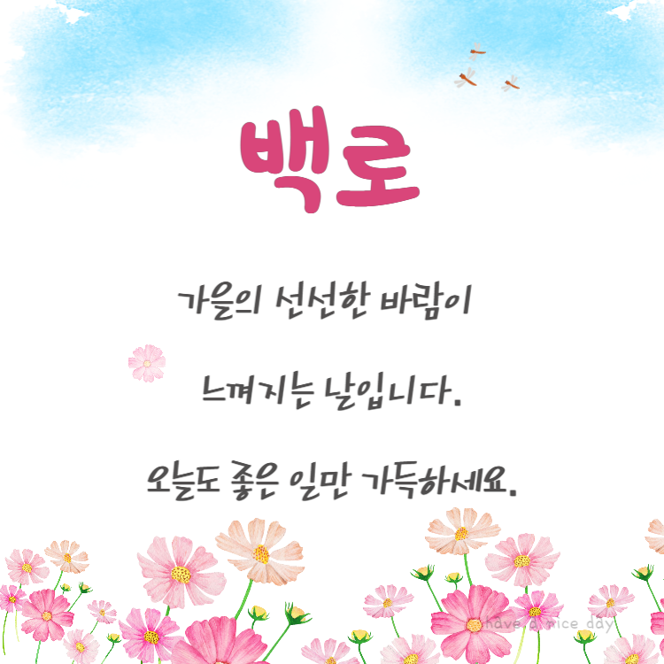 백로가 끝나자마자 추석이 바로 옵니다. 명절 준비로 바쁘실 텐데 오늘도 좋은 하루 되시기 바라고 가족 지인 친구들에게 안부 인사 전해 보세요.