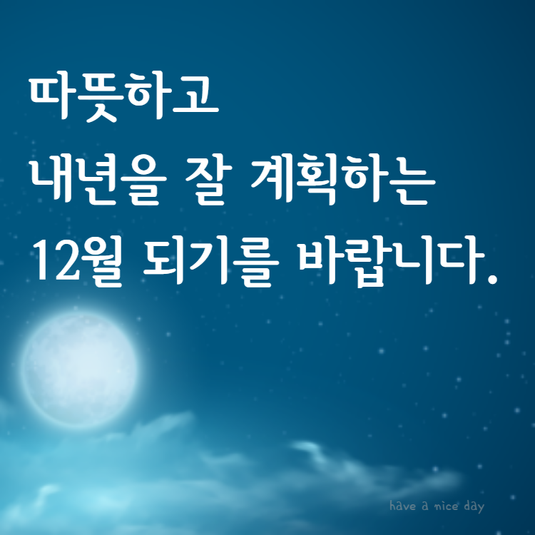 12월 인사말 이미지입니다. 벌써 12월입니다. 남은 한 달 마무리 잘하시고 건강도 챙기는 12월 되시기 바랍니다.