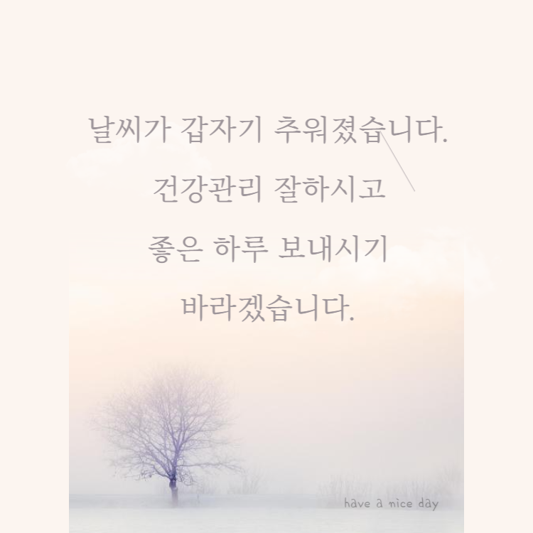 갑자기 추워진 날씨 아침 인사말 입니다. 날씨가 갑자기 추워졌습니다. 건강관리 잘하시고 좋은 하루 보내시기 바라겠습니다.