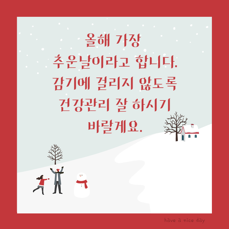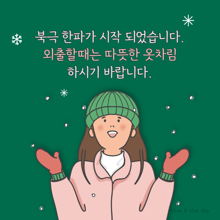 북극한파로 인해 올해 들어 가장 추운 날이라고 합니다. 추운 날씨 인사말 이미지를 만들어 보았으니 가족이나 지인 들게 안부인사 전하기 바랄게요.