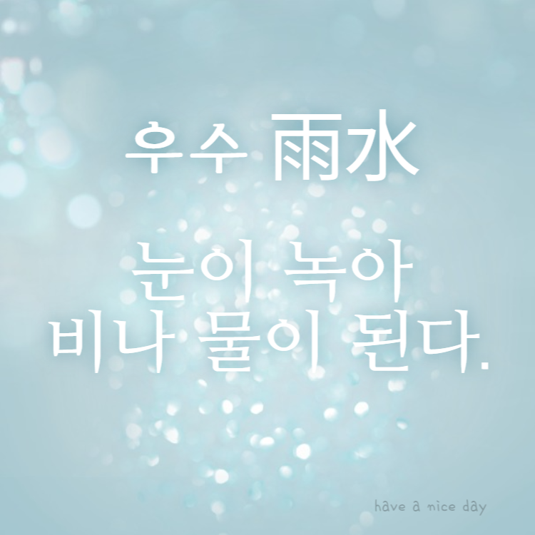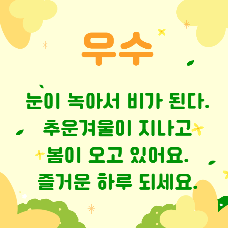 우수는 눈이 녹아서 비가 된다는 뜻입니다. 추운 겨울이 지나고 봄이 오고 있어요. 즐거운 하루 보내세요.