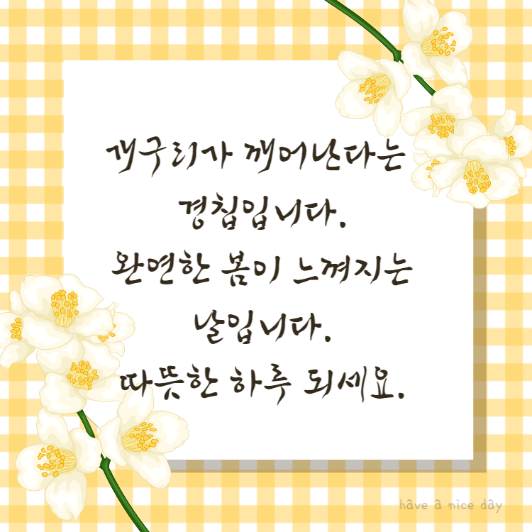 경칩 이미지 인사말을 만들었습니다. 경칩은 24절기 중 하나로 우수와 춘분 사이에 있으며 3월 5일경에 있습니다. 3월이 럼 동식물이 겨울잠에서 활동 시작하는 때로 이제 완연한 봄의 시작을 알