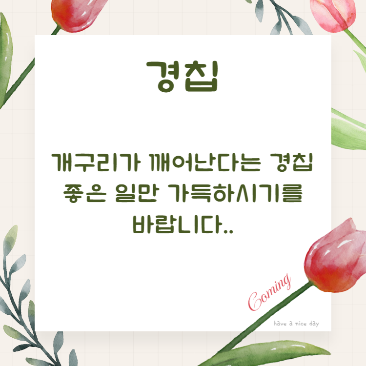 경칩 이미지 인사말을 만들었습니다. 경칩은 24절기 중 하나로 우수와 춘분 사이에 있으며 3월 5일경에 있습니다. 3월이 럼 동식물이 겨울잠에서 활동 시작하는 때로 이제 완연한 봄의 시작을 알