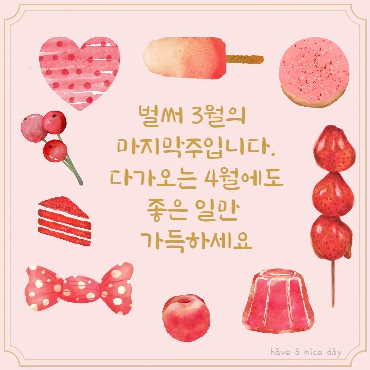 벌써 3월의 마지막주입니다. 다가오는 4월에도 좋은 일만 가득하세요.