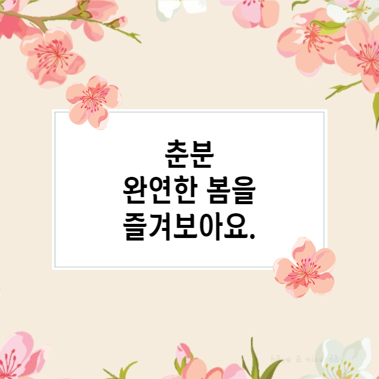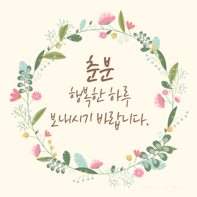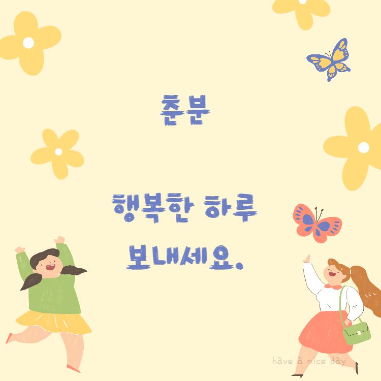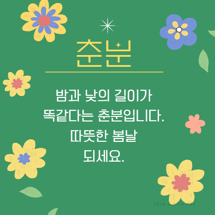 밤과 낮의 길이가 같아지는 춘분입니다. 오늘부터는 낮의 길이가 밤의 길이보다 길어집니다. 날씨도 더 따뜻해지고 본격적인 봄이 온다는 춘분 인사말 이미지 모음을 만들어 보았으니 지인들과 가족에게 안부 인사 전해보세요.