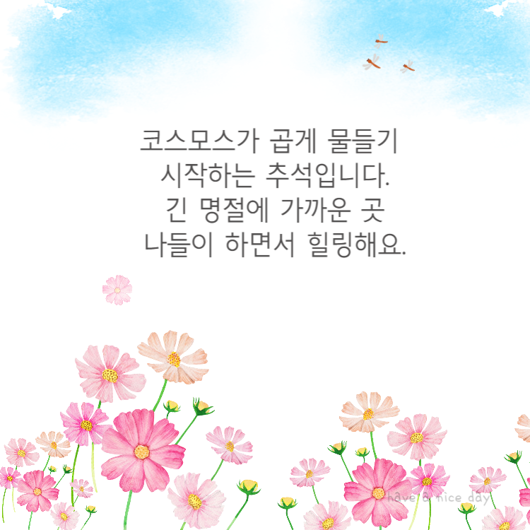 코스모스가 곱게 물들기 시작하는 추석입니다. 긴 명절에 가까운 곳으로 나들이하면서 힐링해요.