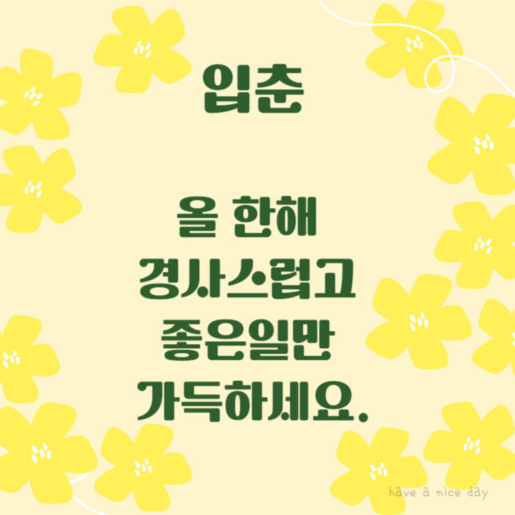 입춘은 우리나라 24 절기의 첫 번째 절기로 봄의 시작을 알리는 날로 양력 2월 4일이나 5일 무렵입니다. 입춘을 맞이하여 보내면 좋은 인사말 이미지를 무료 나눔 하니 카톡이나 문자로 안부 인사