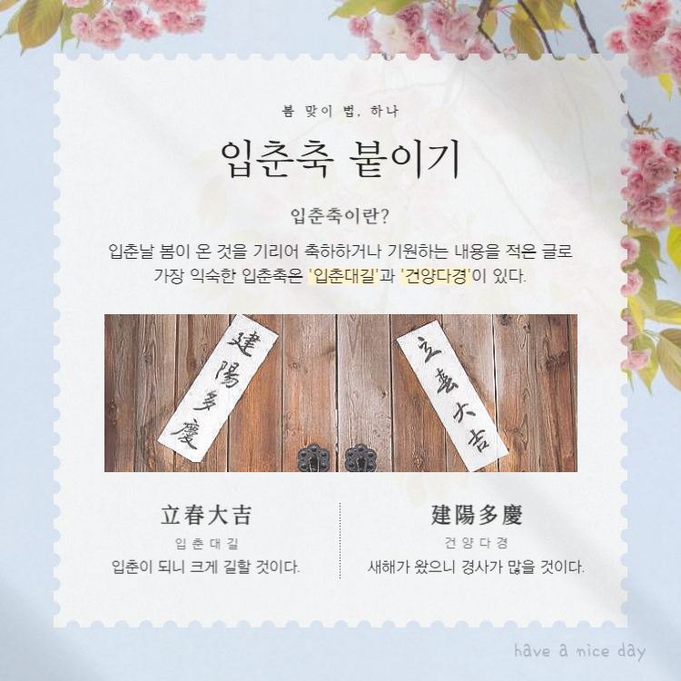 새해 첫 절기 입춘을 맞이하여 다복과 경사를 기원합니다.