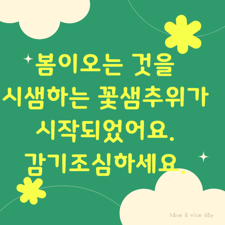 봄이 되니 날씨가 따뜻해지는 것 같았는데 바로 다시 추워지기 반복이네요. 변덕스러운 꽃샘추위 인사말 이미지를 만들어보았으니 가족 친구들에게 안부 카톡 메세지 보내보시는 것은 어떨까요?