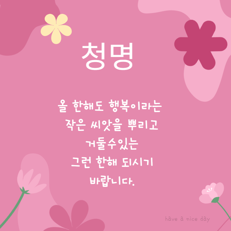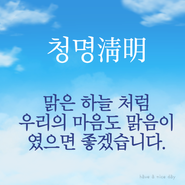 오늘은 24절기 중 하나인 쳥명입니다. 청명은 하늘 맑아진다는 날이지요. 청명에 보내면 좋은 인사말 이미지를 만들어 보았어요. 따뜻한 봄날 안부 인사 전해보세요.