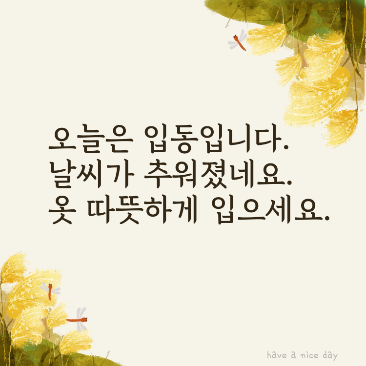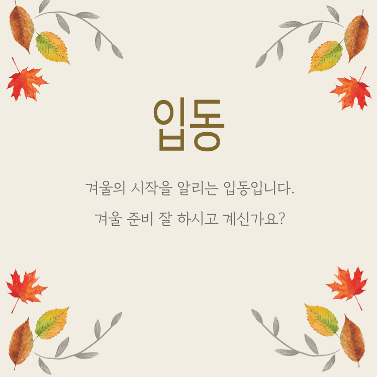 오늘은 겨울에 들어선다는 입동입니다. 24절기에 맞게 오늘 날씨는 급격히 온도도 내려갔고 바람도 차가워졌습니다. 입동 인사말 이미지를 만들어 보았으니 차가운 계절에 따뜻한 안부 인사 전해보세요.
